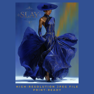 A breathtaking tribute to power, poise, and divine confidence — this hyperrealistic acrylic-style artwork showcases an elegant Black woman in a flowing royal blue couture gown, crowned with a wide-brim hat that radiates grace. The scripture from Philippians 4:13 is softly embedded or optionally removed: