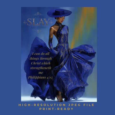 A breathtaking tribute to strength, grace, and divine confidence — this high-fashion digital artwork features an elegant Black woman in royal blue couture, crowned with a matching hat and draped in scripture.