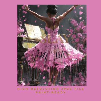 A stunning celebration of Black femininity, creativity, and joy — this high-resolution digital painting captures a graceful woman mid-pose, her ballerina-pink dress melting into piano keys and flower petals. Her raised arms speak of freedom. Her back is arched in gratitude. And the entire scene dances in color and movement.
