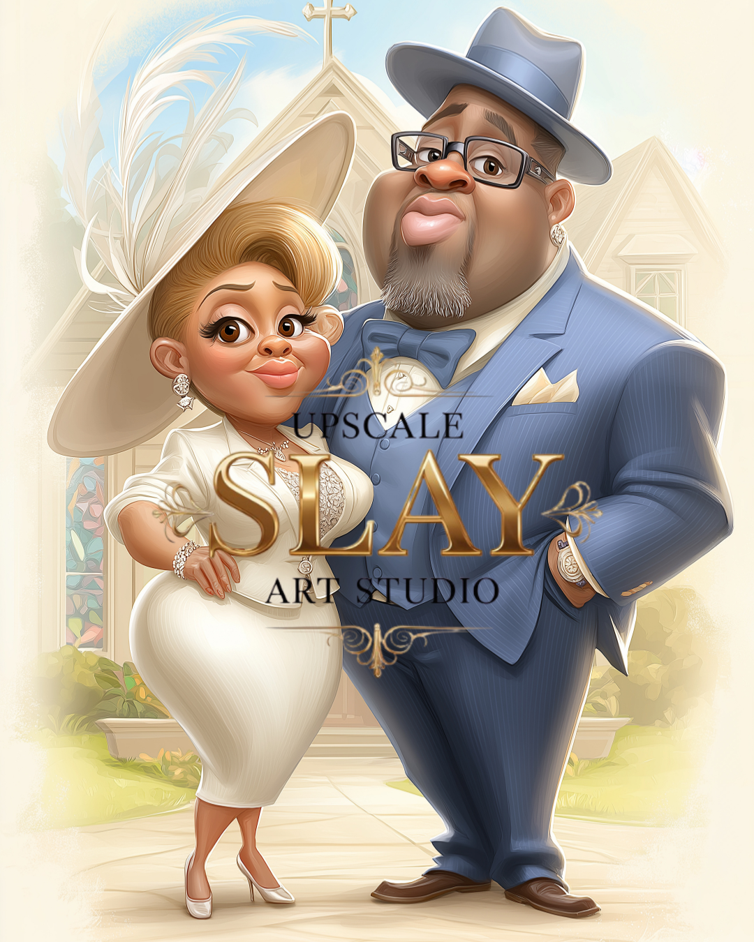 This piece captures a glamorous African-American husband and wife standing proud outside the sanctuary — dressed to the nines, built like legacy, and looking like they’ve been doing this love thing right for a long time.