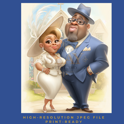 This artwork is a full-figured, fly-to-the-front-row celebration of Black church style + real marriage energy. Sunday Best, but make it COGIC and classy.