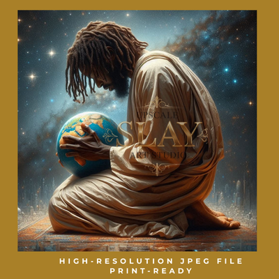 A divine depiction of spiritual responsibility, The Intercessor captures a moment of sacred stillness — a Black man bowed in prayer, clutching the globe as if cradling the very heartbeat of humanity. Drenched in celestial light and draped in humility, he stands as a visual reminder that intercession is not passive... it’s protection, authority, and love in motion. This piece is for those who carry the weight of the world in prayer — and do it faithfully.